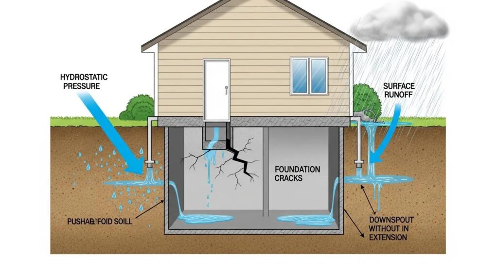 Water finds any path through or beneath the foundation. Common causes are hydrostatic pressure from high groundwater, foundation cracks caused by settling or movement, and surface runoff directed at the house by poor grading or gutters. Addressing these three sources is the starting point for effective waterproofing.