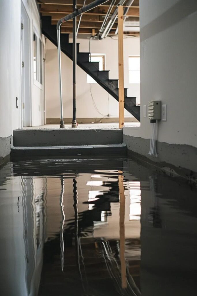 Flooded basement with standing water, visible stairs, and exposed pipes, highlighting the need for effective basement waterproofing solutions in New Jersey homes.