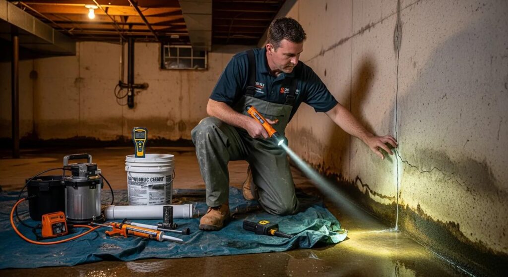 Professional inspecting a wet basement with waterproofing tools emphasizing the importance of basement waterproofing solutions | effective basement solution