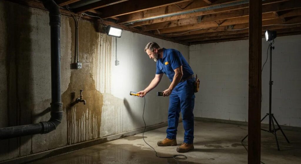 Man inspecting a wet basement wall with a moisture meter, highlighting water damage and the need for waterproofing solutions in Cliffside Park, NJ.