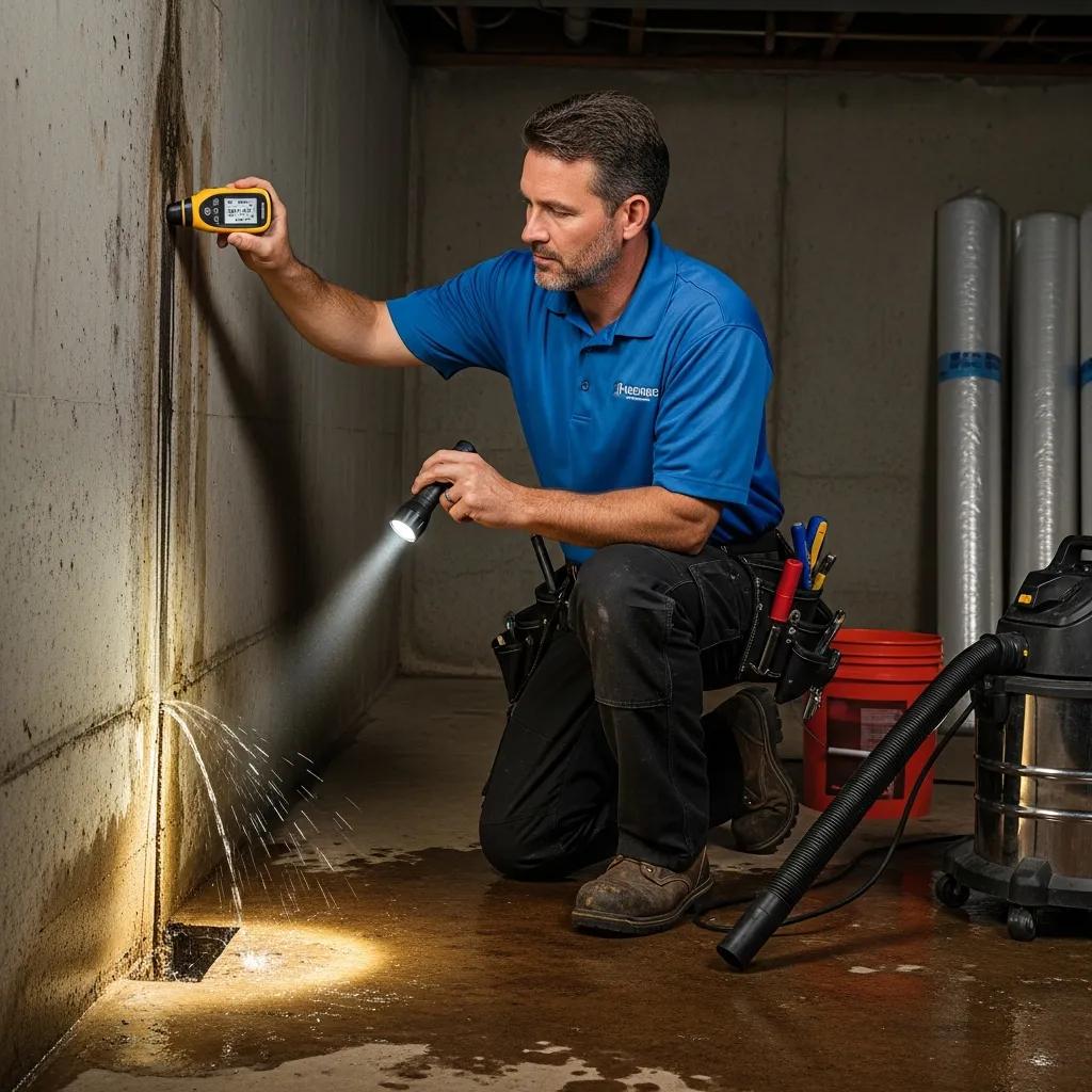 Contractor inspecting a damp roselle basement for waterproofing solutions | effective basement solution